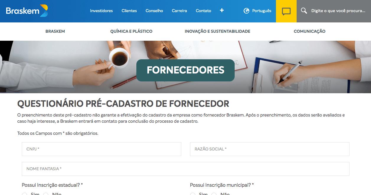 Na página seguinte, basta clicar para acessar o questionário de pré-cadastro. Após o preenchimento, a Braskem avaliará as respostas e entrará em contato, caso seja necessário. No pré-cadastro, deverá fornecer dados como o nome de sua empresa, CNPJ, localização, faturamento atual, tempo de atuação no mercado, ramo de atuação, certificações, entre vários outros.