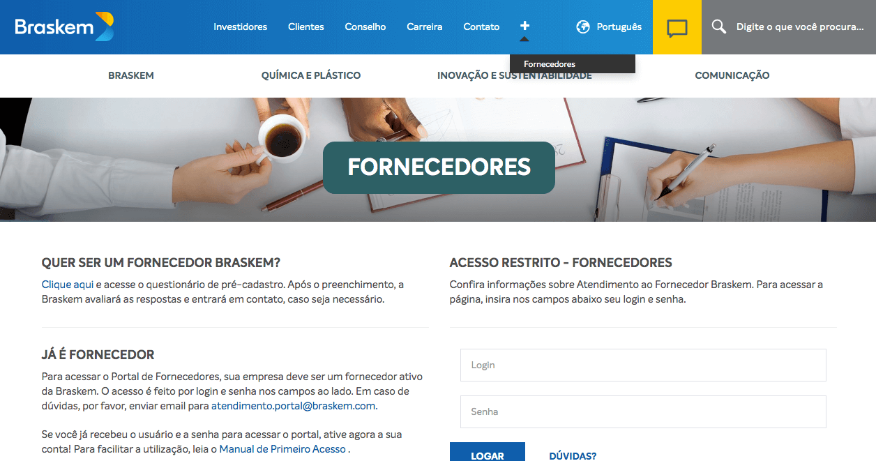 O acesso deve ser feito na página dos Fornecedores (https://www.braskem.com.br/fornecedores)