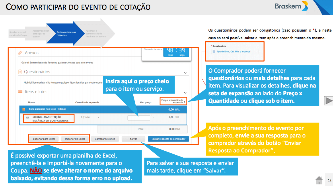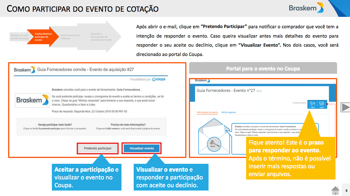 A partir de uma demanda da Braskem, os compradores cadastrarão no Coupa o evento para o sourcing. Cadastrado o evento, os possíveis fornecedores serão convidados para participarem recebendo no e-mail cadastrado o link com um convite.
