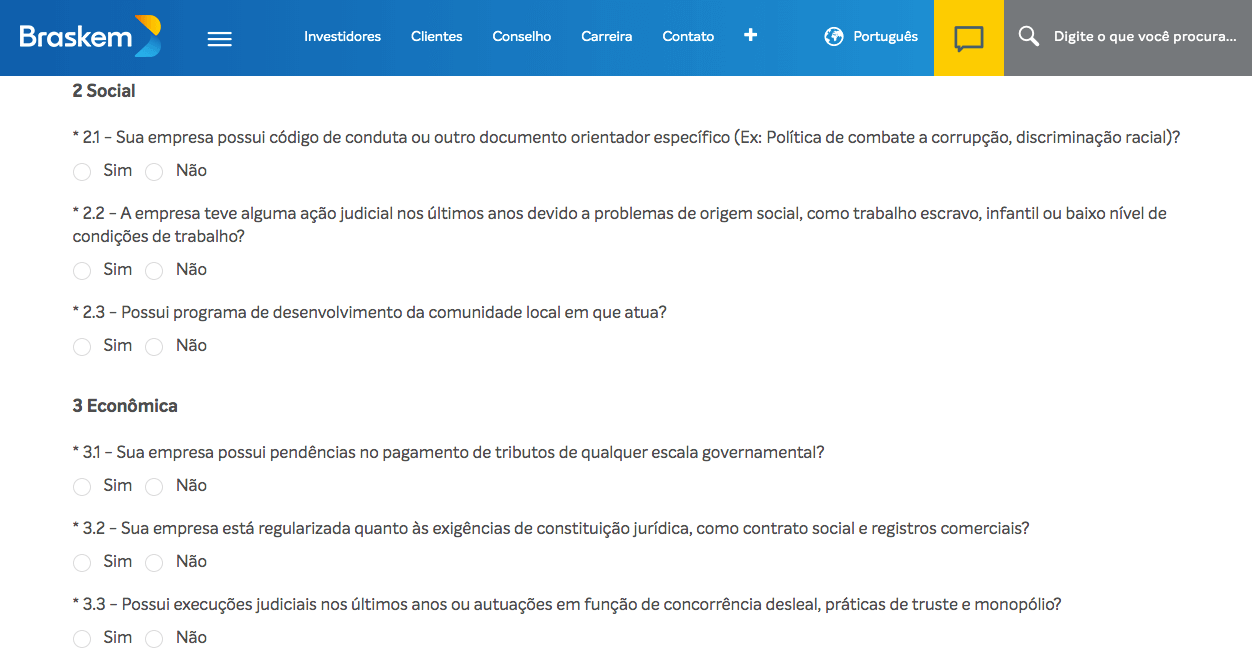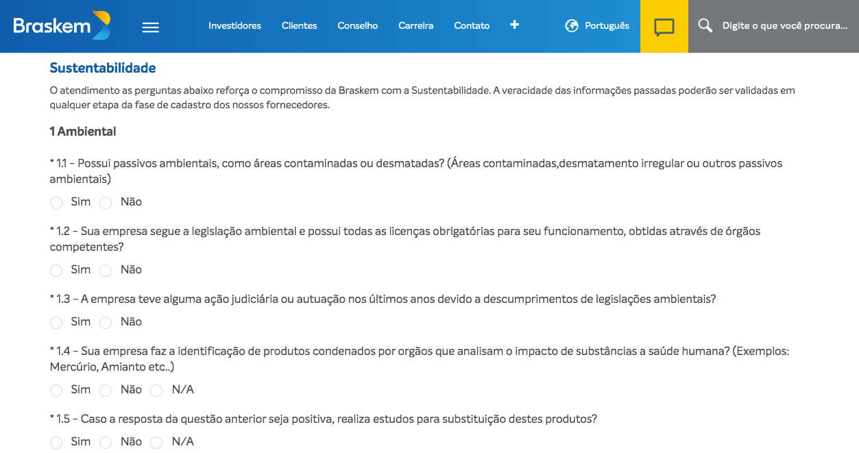 Ao longo do questionário, o futuro fornecedor deverá informar se possui passivos ambientais, como áreas contaminadas ou desmatadas, se segue a legislação ambiental e possui todas as licenças obrigatórias para seu funcionamento, obtidas através de órgãos competentes e ainda se sofreu alguma ação judiciária ou autuação nos últimos anos devido a descumprimentos de legislações ambientais, entre outros questionamentos.
